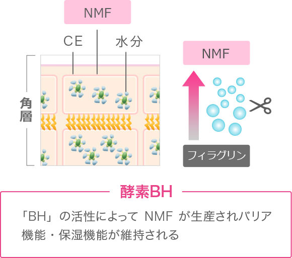 資生堂は長年の敏感肌研究の中で、肌のバリア機能と保湿機能をつかさどる「NMF」に、酵素「BH」が関わっているということを世界で初めて発見しました。