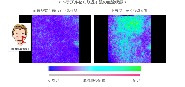 皮ふはむずがゆ因子が増えるなどして炎症が起こると、早く治そうとして毛細血管を拡張・亢進(血管が広がって常に活発な状態)させます。通常は、トラブルが治まると毛細血管が収縮して血流が正常に戻ります。しかし、敏感肌の場合は、バリア機能の低下により炎症と改善が何度もくり返されてしまい、毛細血管の拡張・亢進が戻らなくなり、常態化してしまうのです。つまり、敏感肌特有の「肌の赤み」は、血流がさかんになって肌内部が“ほてった”状態なのです。※今回、資生堂は特殊な撮影機器によって皮ふ深部の血流を撮影することに成功し、トラブル連鎖の原因である肌内部のほてりを発見しました。
