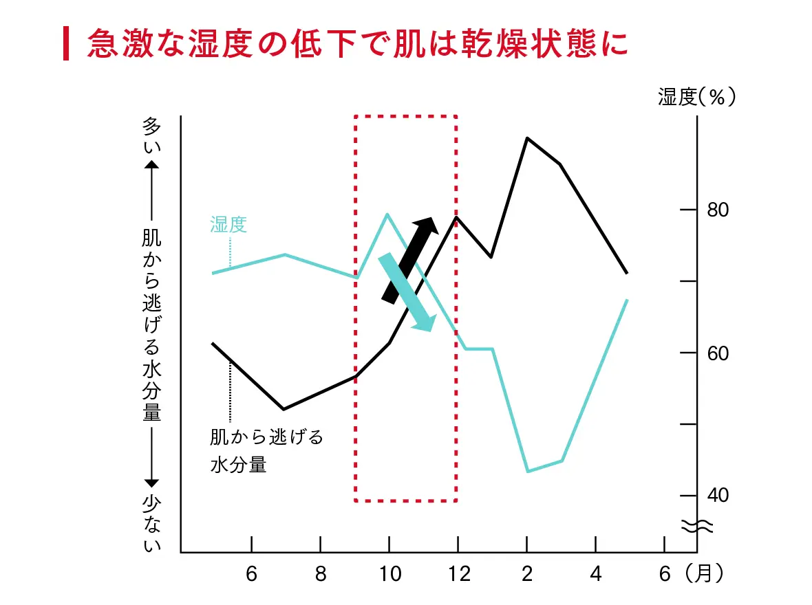 年間で見ると、毎年10月ごろから湿度が急激に低下。肌から水分が逃げることで、乾燥しやすくなります。