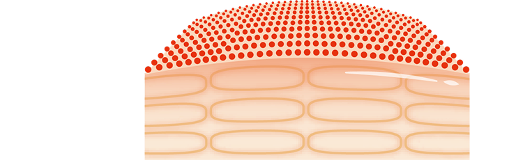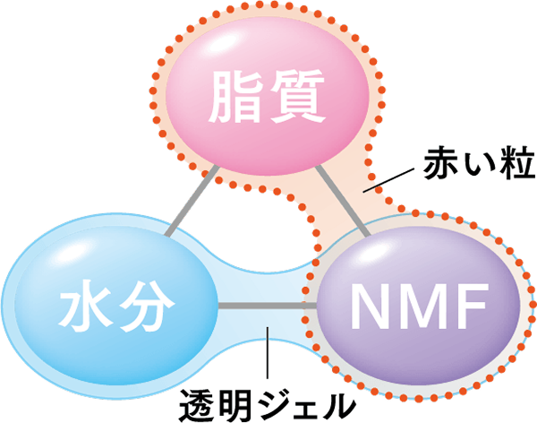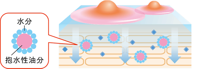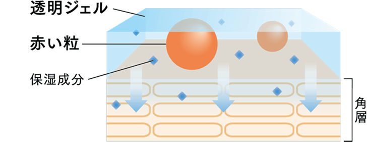 赤い粒から「抱水性油分」がはじけだし水分を角層内に届ける