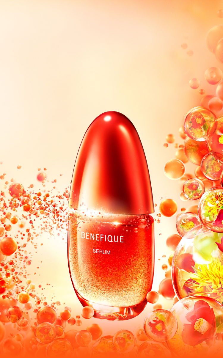 「赤い実の美容液」を構成する、透明ジェルと無数の赤い粒。これらが時間差で浸透することで、リッチなコクとべたつきのなさを実現。容器の中ではとろみがすごくあるのに、つけた後はさらっとするのが特徴です。
