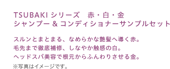 TSUBAKIシリーズ 赤・白・金 シャンプー&コンディショナーサンプルセット スルンとまとまる、なめらかな艶髪へ導く赤。毛先まで徹底補修、しなやか触感の白。ヘッドスパ美容で根元からふんわりさせる金。 ※写真はイメージです。