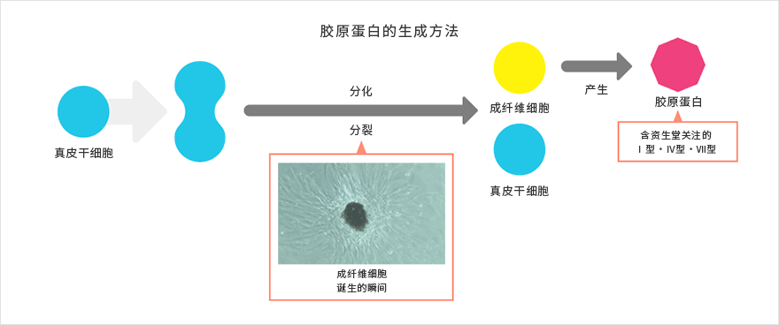 在我们探索这种肌肤变化机制的过程中,终于发现了可以说是成纤维细胞母细胞的「真皮干细胞」。我们发现,通过有效接近真皮干细胞,就能让成纤维细胞恢复活力,持续生成优质胶原蛋白。