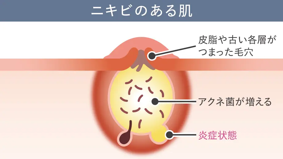 また、ニキビ内部で皮脂を分解して炎症を引き起こす物質を産生したり、アクネ菌自体が表皮細胞に作用して、炎症反応を引き起こすことが知られています。
