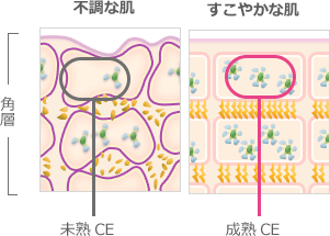 さらに、角層の中の細胞間脂質が乱れバリア機能を守る袋「CE」が未成熟な状態になっています。