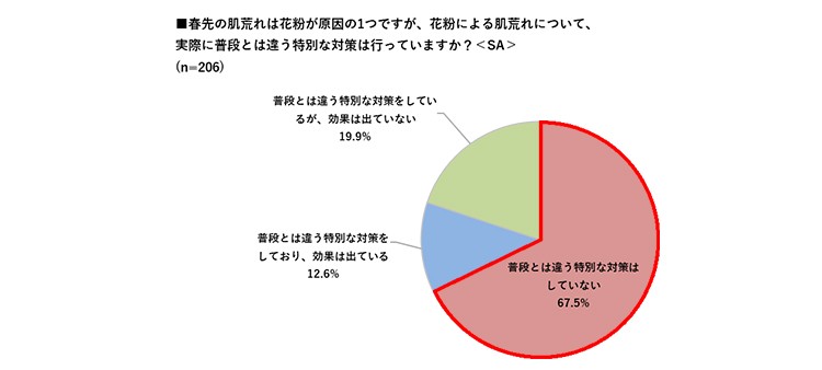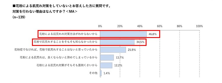 対策をしていない理由としては、46.8%と半数近くの女性が「花粉による肌荒れの対策方法がわからないから」と答えており、「肌荒れは治したいけどどうしていいかわからないから放置している」というジレンマが生まれていることがうかがえます。