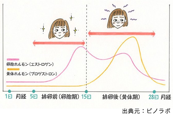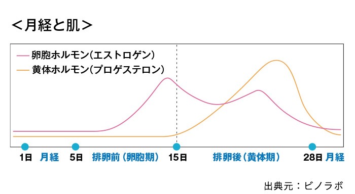 黄体ホルモンは排卵後、黄体が形成されてから次の月経の直前まで分泌されるホルモンで、皮脂の分泌を活発にすることが知られています。皮脂の分泌が多いということは、毛穴が詰まってニキビや吹き出物の原因になりやすく、肌荒れしやすくなるということ。また、黄体ホルモンは優位になると体温が上がって、のぼせやすくなるなどの症状が出るため、黄体ホルモンが優位になる月経前は体調の変化からの肌への影響も考えられるのです。