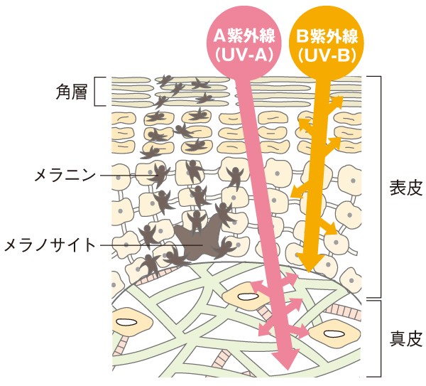 レジャーやアウトドアなど、屋外での日焼けの原因になりやすいUV-Bは表皮に届き、シミやそばかす、乾燥を引き起こします。また、大量に浴びると肌に赤い炎症が発生し、火傷のような状態になることも!