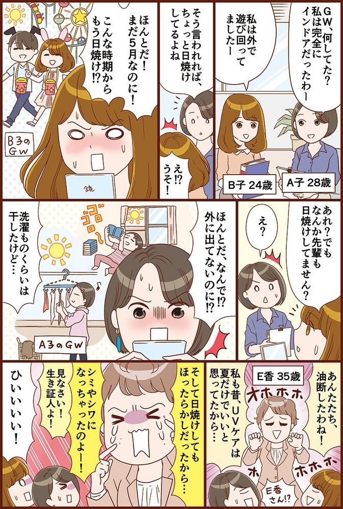 シミの元であるメラニンは、紫外線を浴びると肌の奥で生成が始まります。しかしすぐに始まるわけではなく、紫外線を浴びてからメラニンが定着するまでには3日以上かかると言われています。少しでもシミそばかすができにくくなるよう、日焼け後は早めのケアを