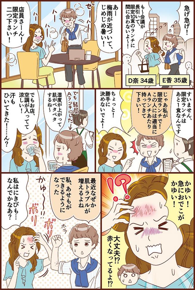 かいた汗や、汗に付着したほこりなどが刺激となって起こしやすいのが、かゆみ。普段は何ともないのに汗をかくとかゆくなる…という人は、肌のバリア機能が低下して少しの刺激にも敏感に反応してしまう状態になっているのかも。また、かゆいからと言って?きむしると傷ができ、そこから炎症が広がってさらなる肌荒れへと繋がってしまいます。
