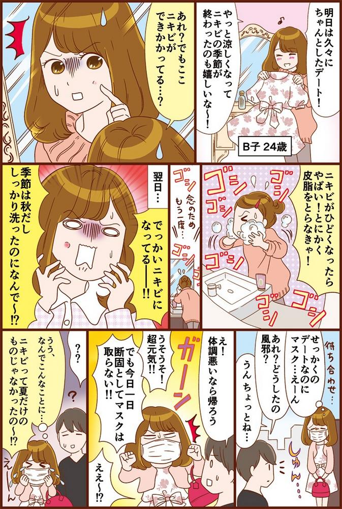 肌の乾燥が引き起こすトラブルは、それだけではありません。実は「ニキビ」の原因になることもあるのです。ニキビは脂性肌や過剰な皮脂分泌によってできるというイメージがあり、乾燥肌とは無縁のように思いがちですが、意外にも冬は乾燥が原因でできるニキビもあります。