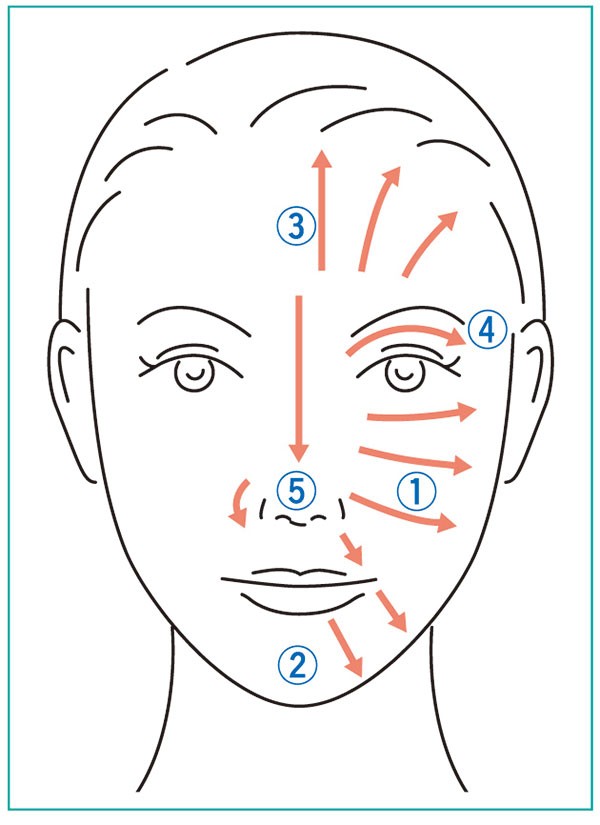 ポイントは、面積の広い部分から塗っていくこと。具体的には、【①頬→②あご→③額→④まぶた→⑤鼻】の順番に塗るのがおすすめです。面積の広い頬から塗っていくことで厚塗りにならず、立体感のある仕上がりになります。