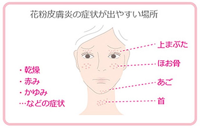 具体的に、花粉皮膚炎の症状が出やすい場所としては、目元や頬の高い部分、あごや首といった刺激を受けやすい部分が多くなっています。