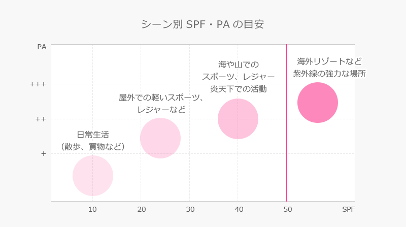 SPFとはB紫外線(UV-B)を防ぐ効果を表す数値で、SPF数値が高いほどB紫外線を防ぐ効果が高いことを表しています。PAとはA紫外線(UV-A)を防ぐ効果を表す指数で、表示の「+」が多いほど防御効果が高くなります。数値が高いものや「+」が多いものがいいと思いがちですが、闇雲に数値の大きいものを使うのではなく、用途や時間など状況や、肌への優しさなどを考慮して選びましょう。