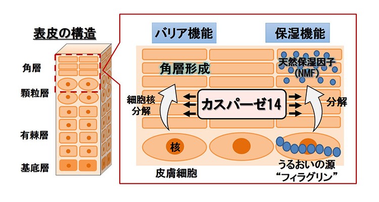 具体的には、寒暖差が「カスパーゼ14」を減少させてしまうことが原因。カスパーゼ14とは、肌表面の角層において、肌をすこやかに保つために欠かせない肌のバリア機能や、うるおいを守る保湿機能などを活性化させる役割をもった成分のひとつです。