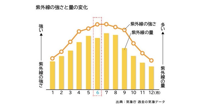 肌を過酷な状態に追い込む要因のなかでも、この時期とくに気を付けたいのが紫外線。なぜなら、5月の紫外線は真夏の8月とほぼ同等の強さと量だからです!