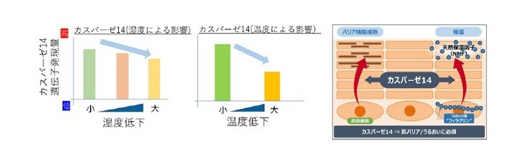 寒暖差を肌が察知すると、バリア機能の形成とうるおいを生み出すために必要な酵素「カスパーゼ14」が減少し、自らうるおう力が低くなってしまいます。そうなると、いくら上からうるおいを与えても肌荒れや乾燥が治りにくくなり、敏感肌になってしまうというわけなのです。