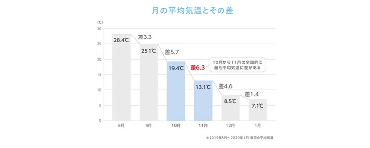 その理由は、季節の変わり目による「寒暖差」。グラフからも分かるように、10月から11月にかけては最も気温差が激しい季節にあたります。