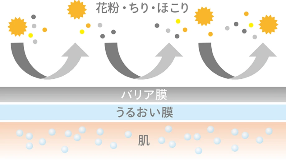 肌のうえにバリア膜をつくり、花粉やほこりなど空気中の微粒子を付着させません。