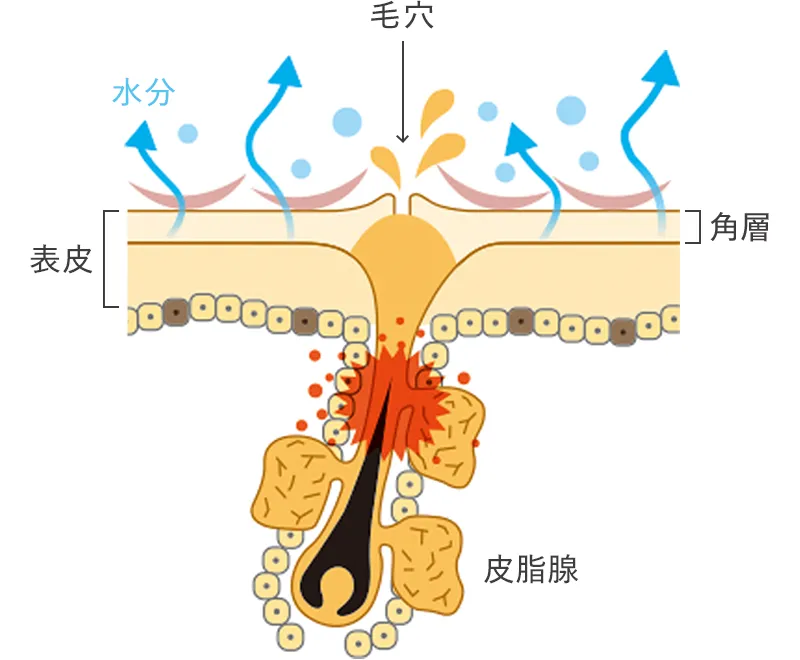 そのため、毛穴が詰まりやすくニキビの原因になったり、毛穴が目立ちやすくなります。