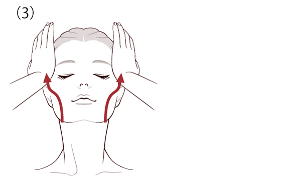 (3)手のひら全体で、フェイスラインから目の下を通り、こめかみに向かって肌を引き上げます。10秒キープします。