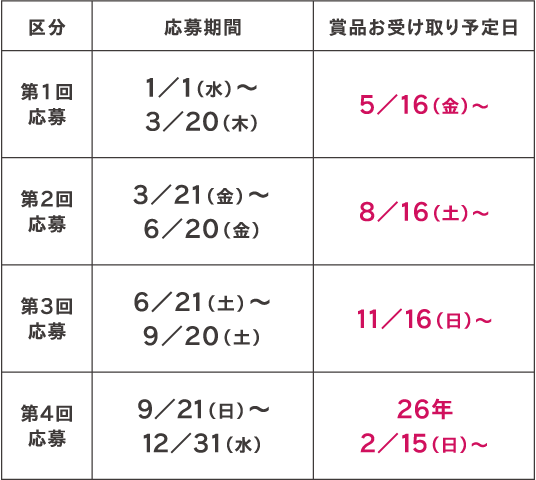 応募カードを提出したお店で賞品を受けとります。賞品の受け取りは応募締切の翌々月です。