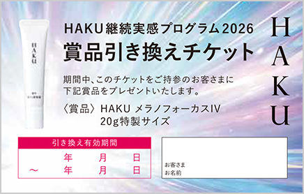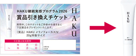 HAKU メラノフォーカスIV(本体・レフィル※数量限定品含む)の外箱バーコードを2枚を貼付したカードを、1本目を購入したお店に提出します。引き換え有効期限が書かれた「賞品引き換えチケット」をお店からもらいます。