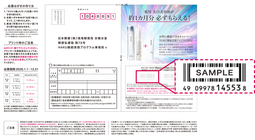 バーコード2枚を貼付し、必要事項を記入して、応募はがきを投函します。