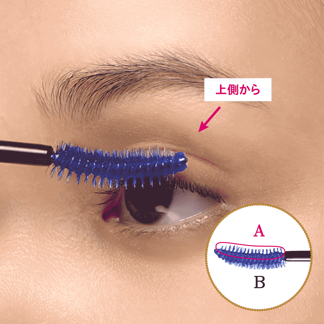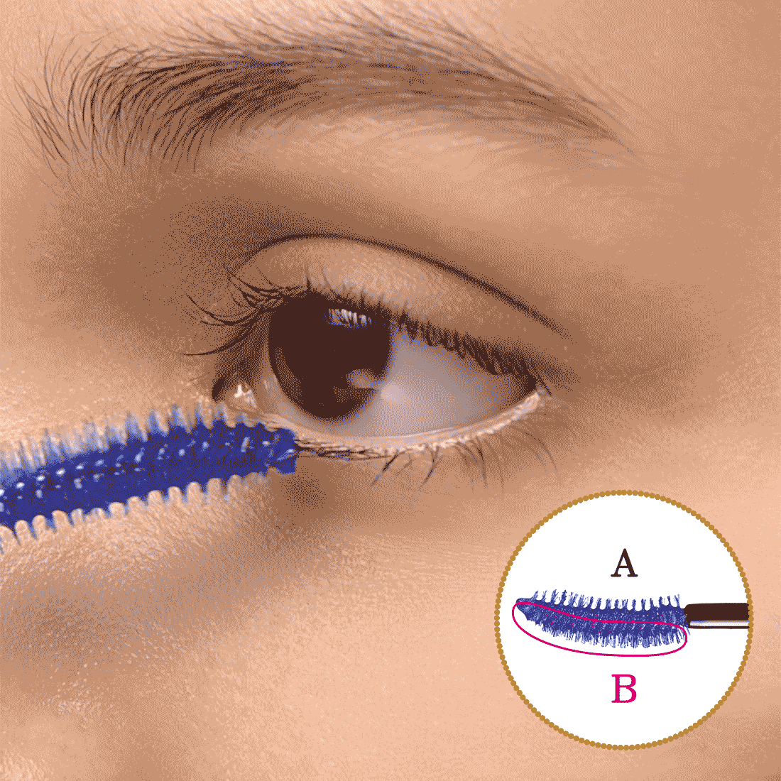 下まつげの先端に塗布するときは、ブラシBの部分を上にして横にスライドさせ、優しく塗布してください。