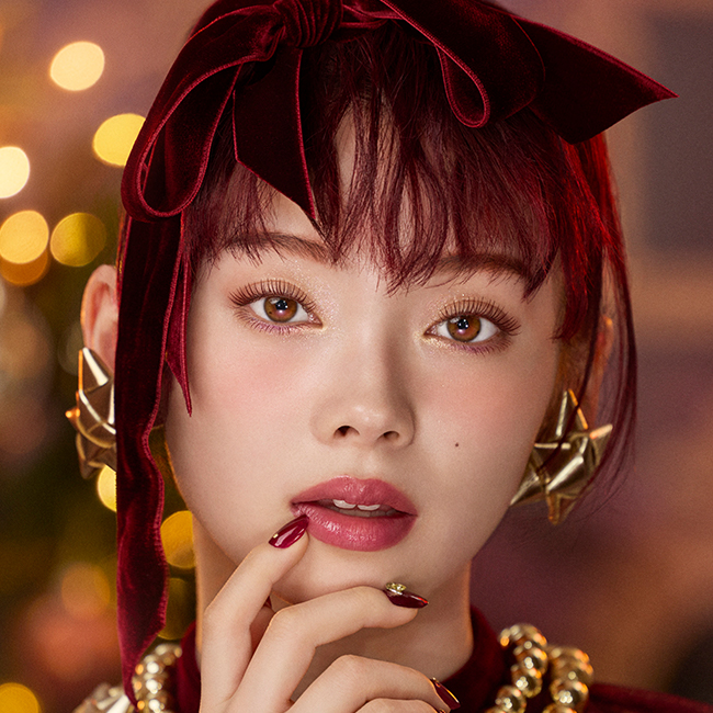 - 1.パフ・デ・チーク(フラワーハーモニー) (PK302)を頬の高い位置に楕円形に自然にぼかし広げます。