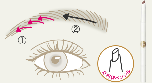 - 2.太い面を使用し、眉中央~眉山に向かって描き、眉頭は軽いタッチで自然に描きます。