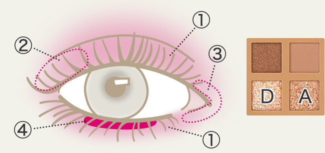 - 1.シャドーフラッシュ (BR202)のAを上下まぶた全体に広げます。