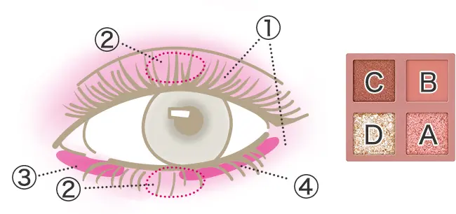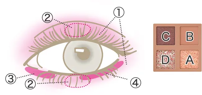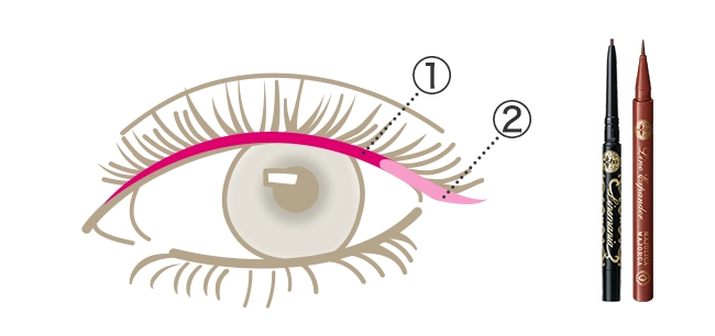 ラインマニア(BR666)でまつげのキワを埋め、ラインエキスパンダー(GY817)で目尻に細く長めに描きます。