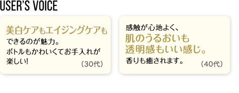 User’s Voice「美白ケアもエイジングケアもできるのが魅力。ボトルもかわいくてお手入れが楽しい!」30代「感触が心地よく、肌のうるおいも透明感もいい感じ。香りも癒されます。」40代
