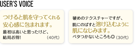 User’s Voice「つけると肌を守ってくれる安心感に包まれます。最初は高いと思ったけど、結局お得!」40代「硬めのテクスチャーですが、肌にのばすと溶け込むように肌になじみます。ベタつかないところも◎」30代