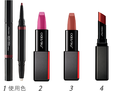 他の色を見る>モードなブラック系コーディネートには、お互いの個性を引き立て合うブラウン&ベリー系のリップがマッチ! ファッションとメイクの温度感を揃えることで、クールなかっこよさがアップします。