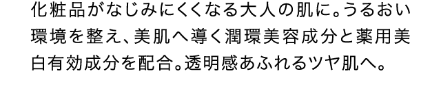 化粧品がなじみにくくなる大人の肌に。うるおい環境を整え、美肌へ導く潤環美容成分と薬用美白有効成分を配合。透明感あふれるツヤ肌へ。
