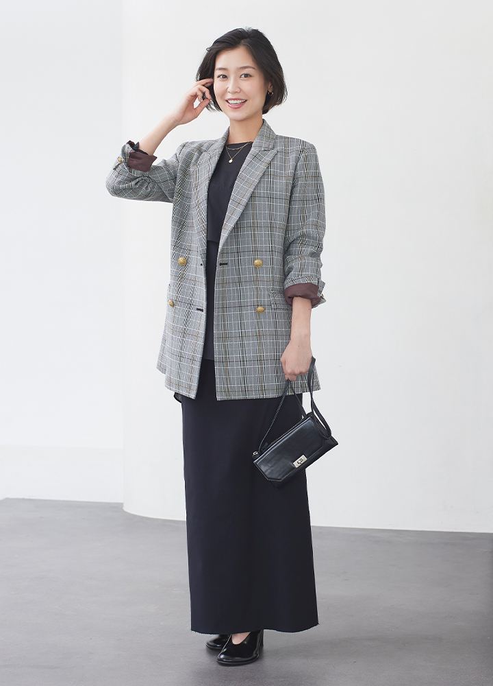 アイラインスカートとビスチェレイヤードのシャツをオールブラックでコーディネート。チェック柄のジャケットを羽織ることで、今っぽさと奥行きをプラス。華奢なアクセサリーを2連で重ね、さり気ない女性らしさを演出。艶感のあるバッグとシューズもアクセントに。