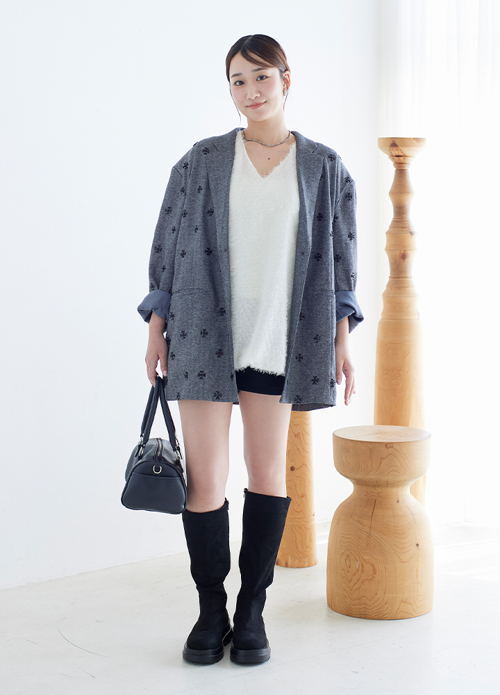 目を惹くビジューが施されたジャケットに、シャギーのチュニックで異素材を組み合わせました。遊び心のあるビジューアイテムは今年トレンドですが、ブラックのビジューは色味が落ち着いているので大人っぽさを引き立ててくれます。チュニックの素材はとても柔らかく、優しい印象を与えます。相反する異素材で、ワンランク上のコーディネートを叶えました。素材がポイントなので、その他ボトムや小物はブラックでまとめてメインアイテムを引き立たせたスタイリングです。