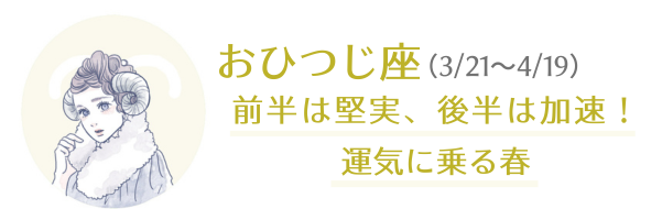 月の上旬は地に足をつけて堅実に、月の中旬以降は情熱の赴くままに勢いをつけて…と、メリハリをつけて過ごすといい星回り。新年度は誰しもフレッシュなムードのなか心機一転!というムードを感じやすいのですが、この春のおひつじ座さんはその度合いがこれまで以上に高まっていることでしょう。ハードルの高い目標も、エネルギッシュかつ粘り強く取り組める今なら、決して「不可能」ではないのだろうと思います。新しいことに挑戦するなら月の中旬がベストでしょう。