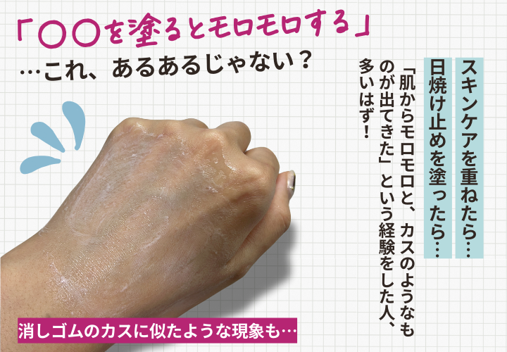 「先に使用した化粧品がよくなじんでから・次に使用する化粧品を適切な量で・肌をこすりすぎないようになじませる」ことがモロモロを防ぐポイント。この心得3か条、今日から一緒に意識して化粧品を使いましょう!