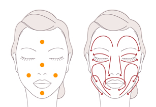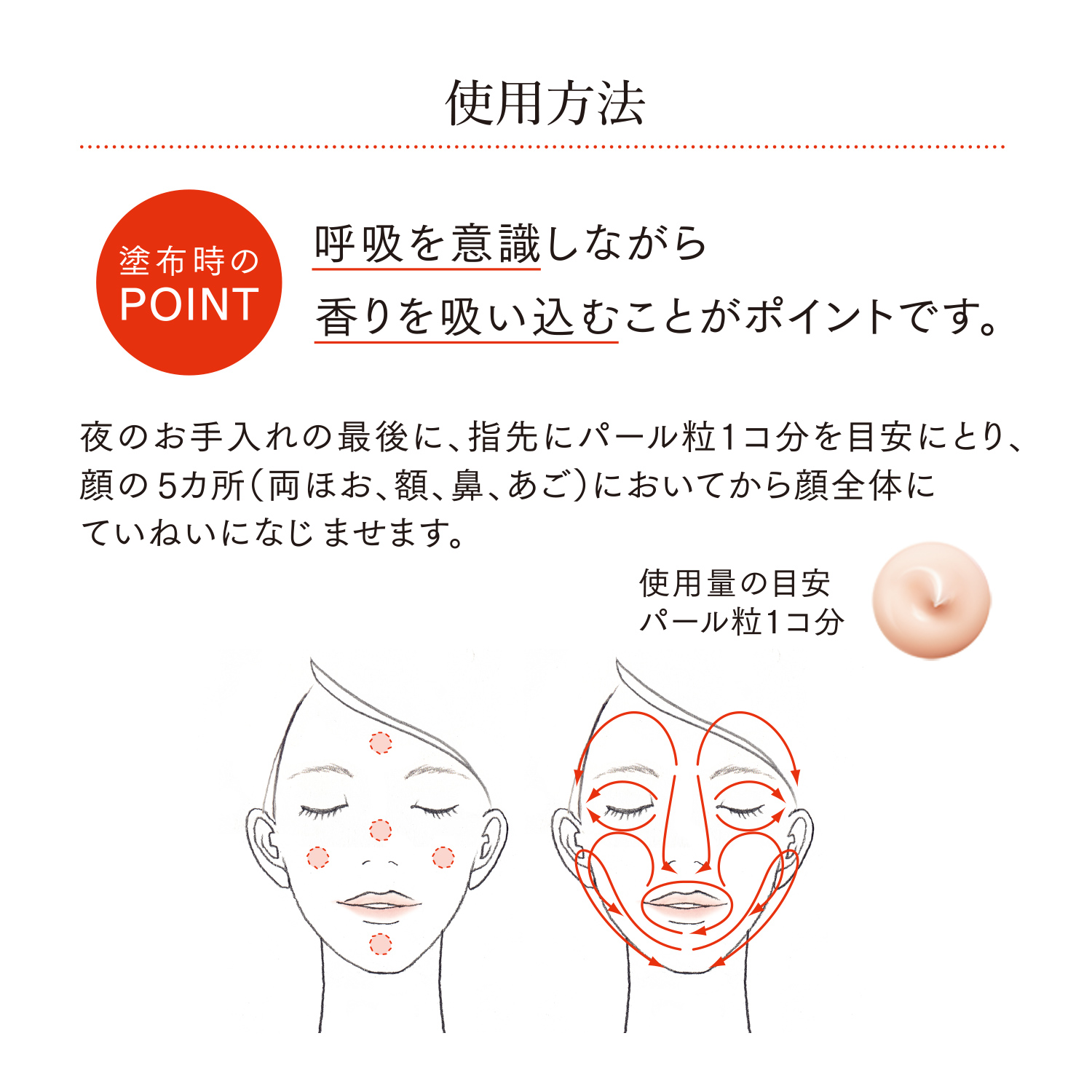 ●夜のお手入れの最後に、指先にパール粒1コ分を目安にとり、顔の5カ所(両ほお、額、鼻、あご)においてから顔全体にていねいになじませます。
