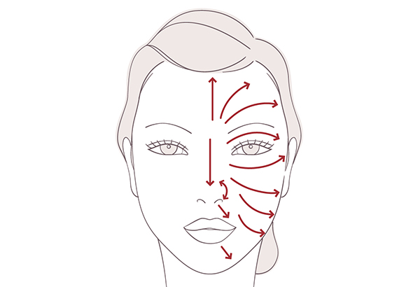 ●スキンケアなどで肌を整えた後、手のひらに適量をとり、顔の片側ずつ仕上げます。中央から外側に向かって素早くのばします。