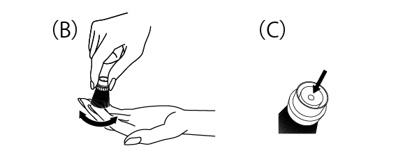 ・ブラシと根元部分(C)の水気をティッシュペーパー等で拭き取り、風通しの良い日陰で、十分に乾かしてください。ブラシと根元部分が完全に乾いたことを確認してから容器にセットしてください。