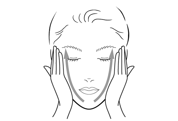 ●手のひら全体を使い、ほおを包みこむようにして、あご先からこめかみまで持ち上げます(3回)。