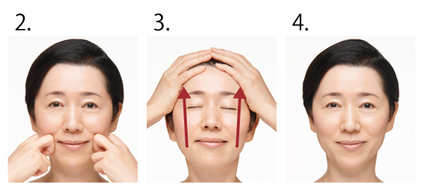 3.口もとから目もと、額までグーッと伸ばすように引き上げ、5秒ほどそのままキープします。