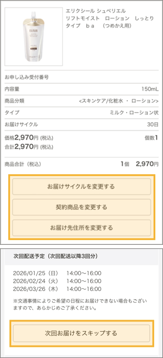 次回お届け予定日の15日前までに、マイページで、ご契約内容(スキップ)の変更ができます。