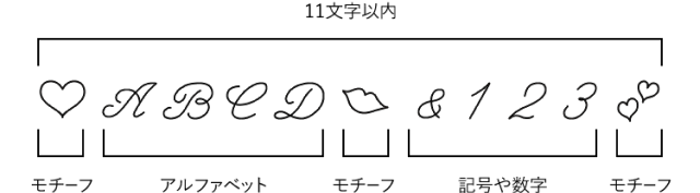 • ※ 大文字とモチーフのみを組み合わせる場合は8文字以内を推奨いたします。大文字とモチーフを8文字以上組み合わせる場合は長体がかかる可能性がございます。