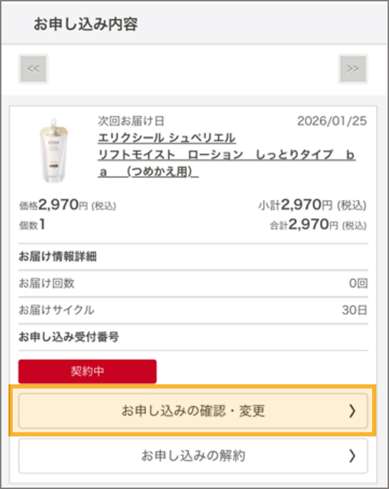- 2. 資生堂オンラインストアでは、お客さまに事前に告知のうえ、定期お届けサービスの内容(お届けする商品の内容・タイプ、価格、割引率、送料、お届け方法、お届けサイクル、お届け日時等、定期お届けサービスに関連するすべて)を変更する場合があります。変更後の定期お届けサービスの利用を希望されない場合は、マイページより、別途お知らせする期日までに変更又は解約のお手続きをしてください。所定の期日までに変更又は解約の手続きをされない場合は、変更内容を承諾したものとみなします。