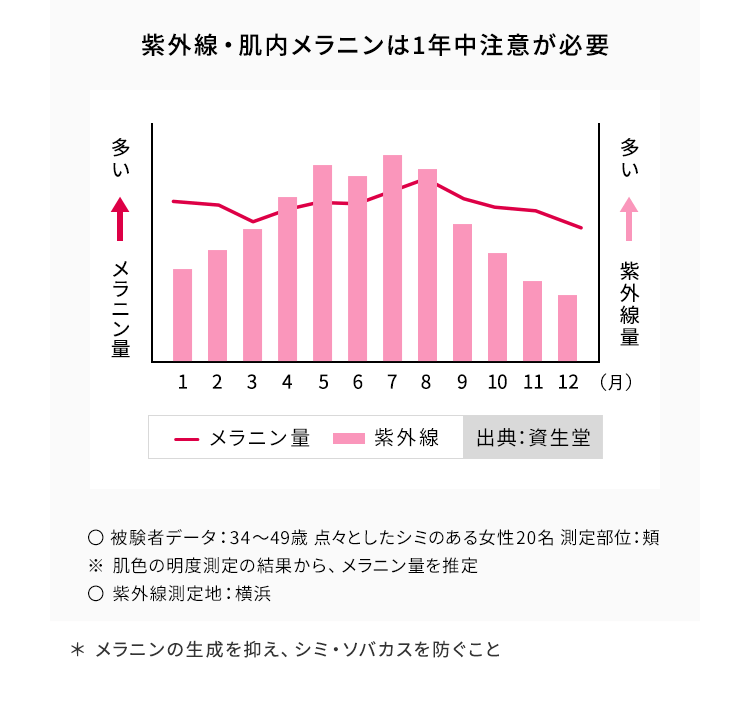 美白:メラニンの生成を抑え、シミ・そばかすを防ぎます。